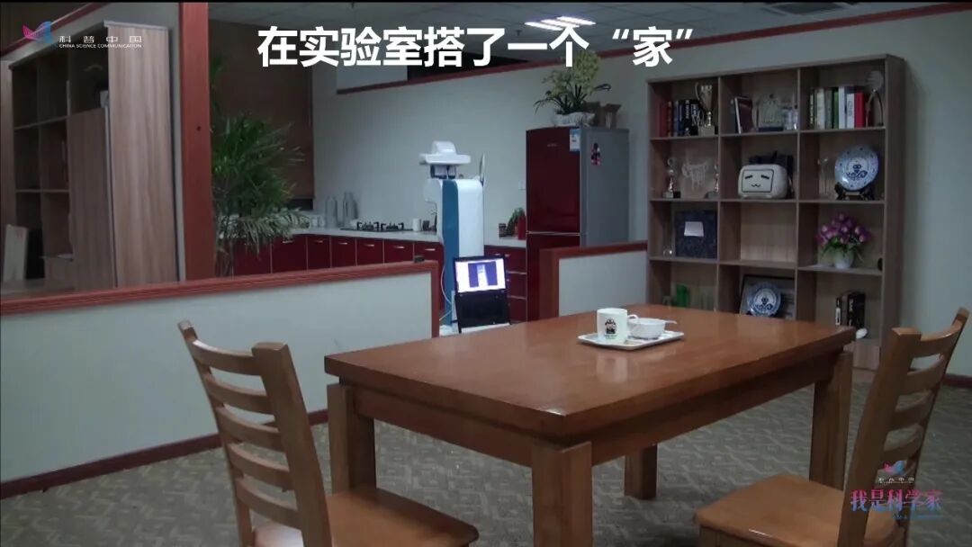 我们先在实验室里为机器人搭了一个家,在这里做一些试验。这是客厅,远一点是厨房——厨房里什么都有的,是真的能做饭的厨房,再旁边是卧室。