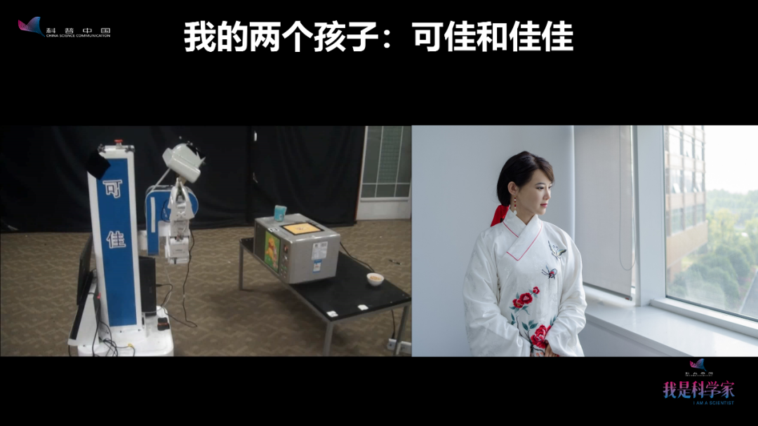左边这个是可佳机器人。看起来其貌不扬,但是聪明能干、任劳任怨。右边这位美女是佳佳机器人,非常漂亮。有人问,能不能将它们合到一起?将来会合到一起的,未来我们的机器人会上得厅堂,下得厨房。