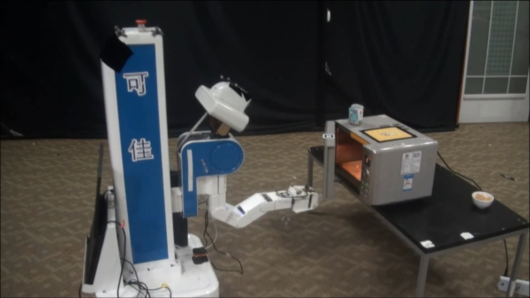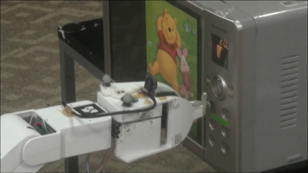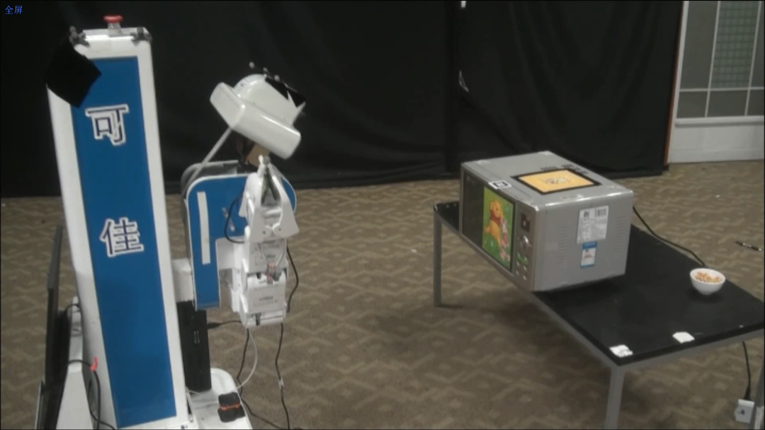 现在可佳还是有相当多办法,它想一想就知道该怎么办。但它一关门,这个微波炉又移动了,然后它要去按那个按钮,按钮的直径不到10毫米,它的偏差只要有3毫米就按不准,这对移动操作机器人非常难。所以需要用到强力法加训练法,再加上融差性原理,现在按这个按钮就相当准了。
