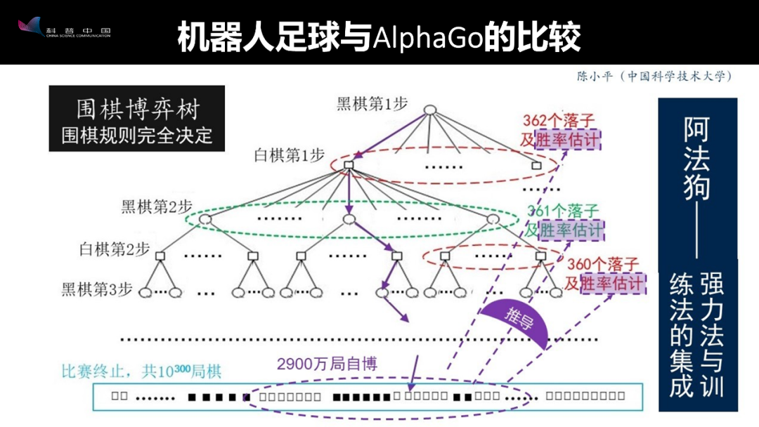 机器人足球也有一棵博弈树,但它比围棋博弈树复杂太多。首先,围棋比赛是1:1,而机器人足球赛是11:11,这是第一个区别;第二个区别是,围棋中一步棋最大的选择是有362种,而机器人足球“仿真2D”比赛中,每一步都有3700万种选择。所以,我们人工智能程序要从那么多选择里选出最优的,比阿尔法狗还要复杂。