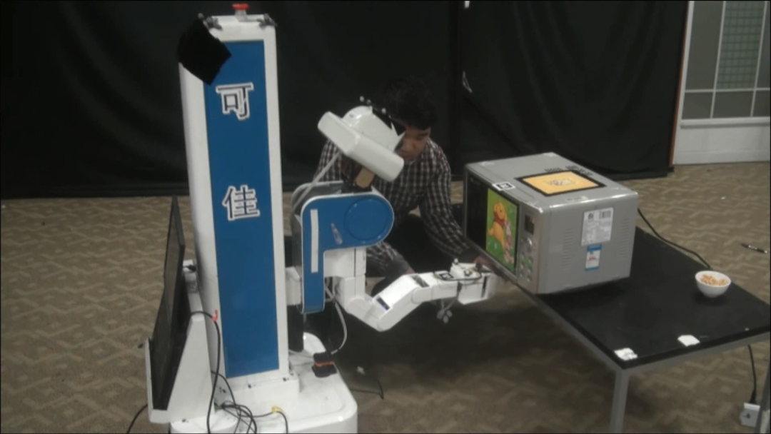 这个视频就是可佳机器人在家里操作微波炉来帮你加热食品。这个视频里的操作相对简单,就是加热牛奶。2010年,可佳就可以做这件事了,不过还只是在实验室的环境。如果未来将可佳引入千家万户,每家的环境都不一样,而且用户的行为也有可能干扰机器人,会发生什么样变化、产生什么干扰,事先是无法预知的,这就是非封闭性。