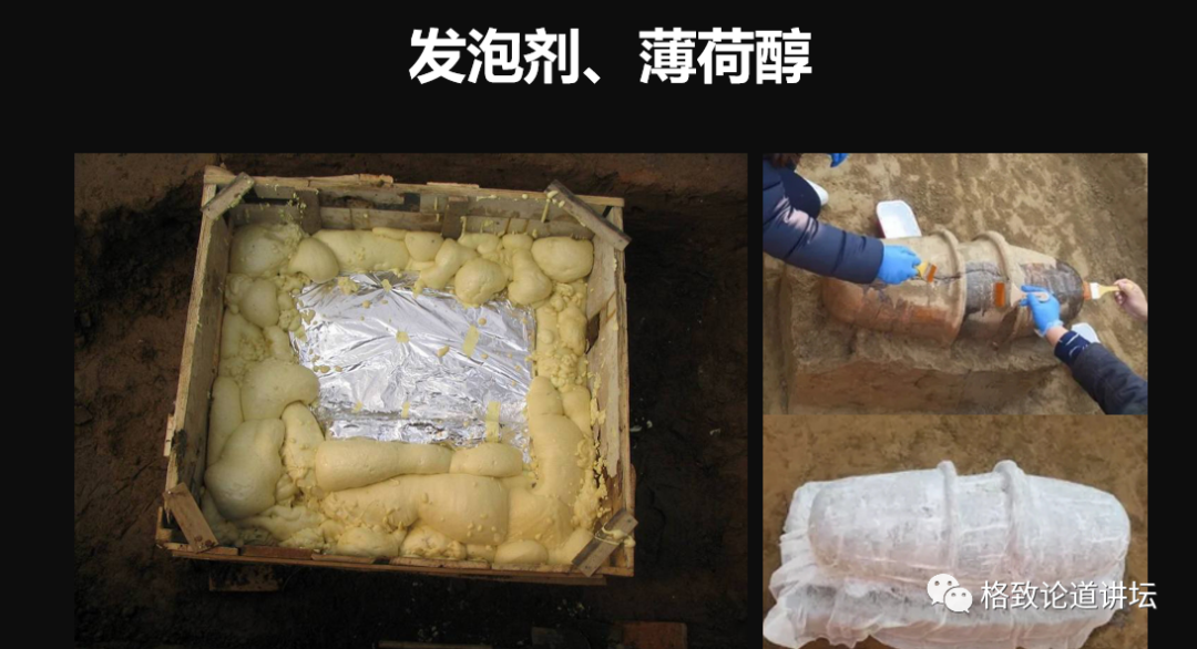 加热变成液体后,就可以涂在文物的表面,凉了之后文物表面就硬化了,就方便提取了。