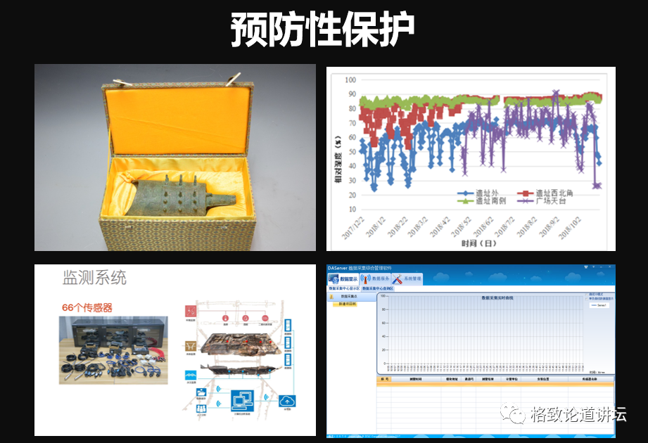 右上角的这张照片就是我们监测文物的温度和湿度的曲线。下面两张是监测的界面,只有把文物放在合适的温度和湿度里面去保存,才能确保它不会再被腐蚀。