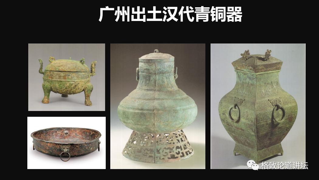 广州出土最多的青铜器是我们南越王墓,广州出土汉代青铜器主要器型有,像左上角的铜鼎,左下角的一件铜洗,中间是铜壶和铜钫,然后还有一些环首刀、提梁壶和铜镜等。