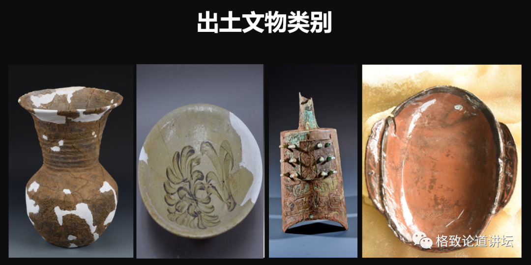 出土的文物类别也非常丰富,比如左边第一个是陶器,第二个是瓷器,第三个是青铜器、铁器,然后是漆木器。