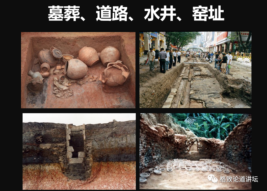 考古会发掘很多的遗迹现象,比如左上角的墓葬,右上角道路,还有一些水井,左下角的窑址。