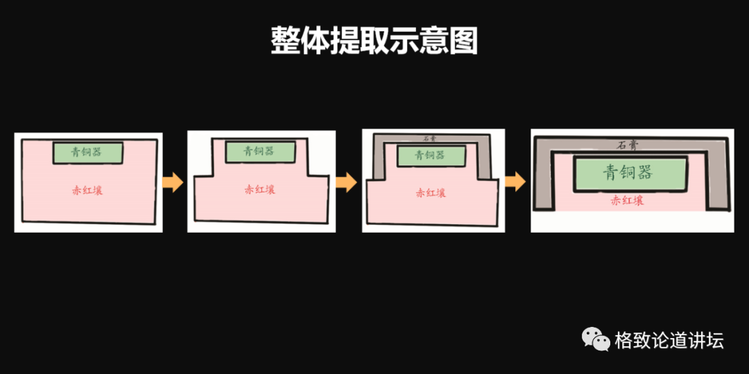 这是考古现场整体提取的一个示意图,绿色是青铜器,我们在青铜器分布的土台切割出来,上面铺一层石膏,等石膏硬化后,再从下面切下去,用石膏撑出脆弱的青铜器,就可以提取到室内了。