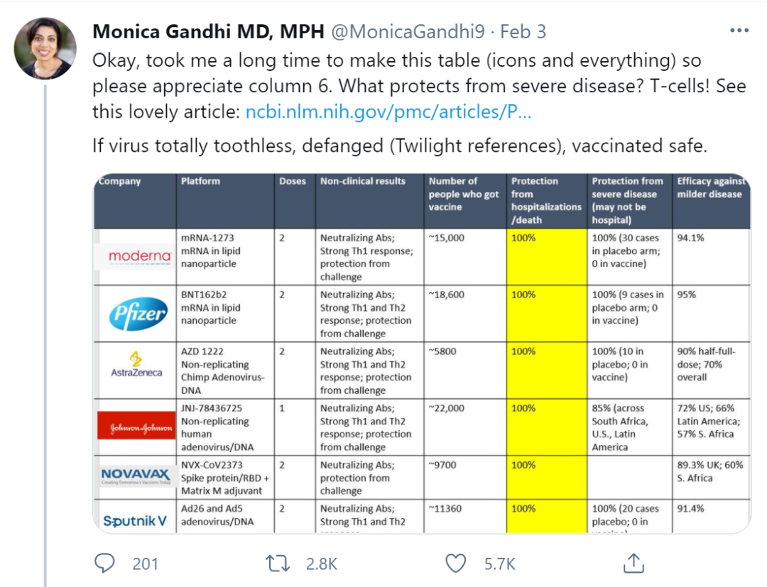 疫苗等效论在社交媒体上同样流行。拜登团队前成员的USA Today专栏链接到一张推特上的数据表(图1),由感染科医生Monica Gandhi所制。表格上是6种不同疫苗的各种试验结果,“住院/死亡预防 “一栏用了黄色高亮显示,下面每一格都写着100%,看上去齐刷刷的一列。
