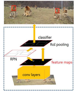 图像经过目标检测算法Faster-RCNN后,会被方框标记为“猴脸所在区域”。从分类的角度来看,框内的位置会被标记为1,框外被标记为0;从宏观的角度来看,就是机器识别出了猴脸的位置。