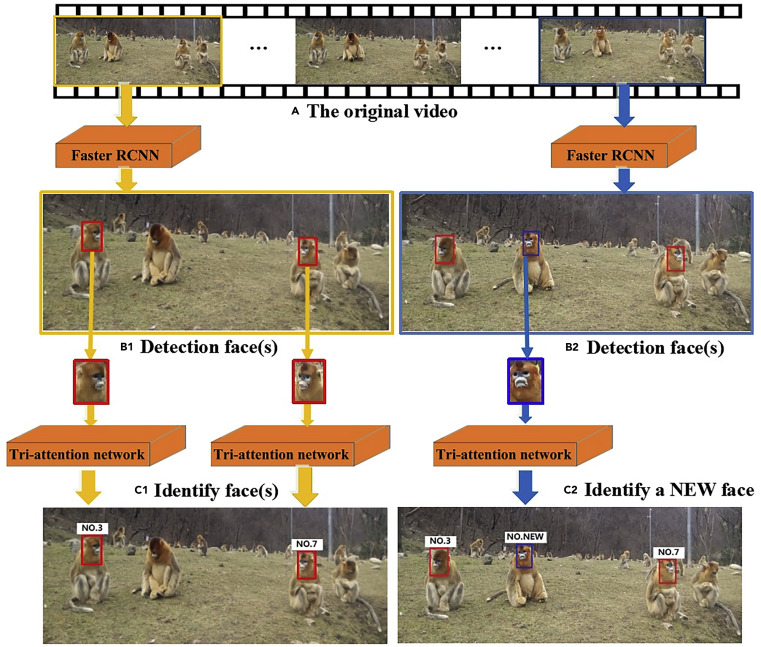 “Tri-AI”系统一共分为目标检测(确定图像中哪个框框内是猴子脸)和对象识别(区分这张脸到底是哪只猴子的)两大部分。