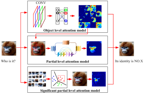 在对象识别的问题中,输出的答案是“猴子ID”,也就是辨认具体是哪只猴子。图中经过三个包含注意力机制的网络,框内的猴脸会被标记成“3号猴子”、“7号猴子”,从未在训练集出现的则被标记为“新猴子”。
