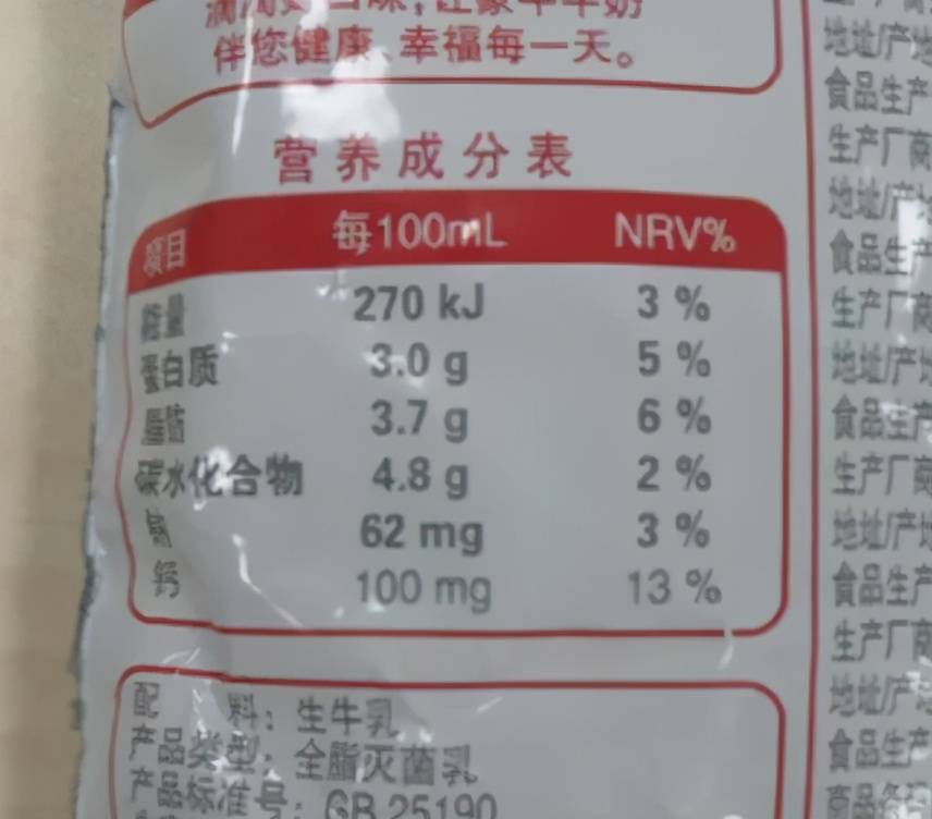 另外,从热量上来看,一袋200mL牛奶,全脂和脱脂的热量差值约为62kcal。如下图: