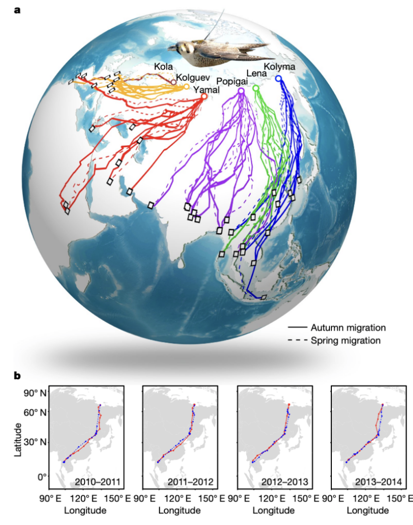 近日,中国科学院动物研究所詹祥江实验室通过整合多年鸟类卫星追踪数据和种群基因组信息,建立了一套迁徙系统,揭开了北极游隼迁徙的秘密,相关研究成果于北京时间3月11日以封面文章发表于《自然》杂志。