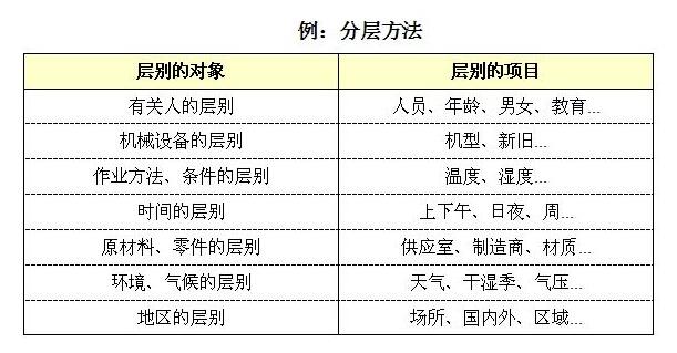 测定值是依据所取得之特征(例如制品种类、机械装置、工具或原料、材料、零件、作业种类等),分成两个以上不同的集团。假如有任何因作业员、机械或原料的不同而影响到成品品质时,我们即可将测定值按其层次之不同分别整理,使其更容易了解,而在获得有益的情报时能够派上用场。