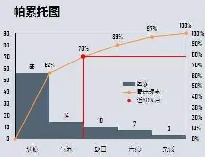 同时也是累积次数曲线表示图,这种图表对最有问题的不良、工程、成品最具功效。同时如果想要解决的话,也可以预测其所达到的功效如何?以上所谓不良解析的工作就叫柏拉图解析。