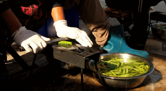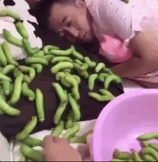 一条条绿色的虫子浸泡在水盆中,像是在享受临终前最后一次泳池派对,至于谁先上“刑场”,全凭大妈的命运之手。
