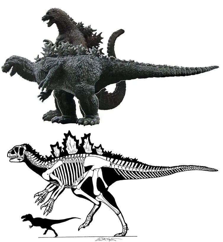 哥斯拉的直立姿势介于蜥蜴和恐龙之间,非常独特。图片描绘了如果它和恐龙采用同一种站姿的样子。| 图片来源:Kenneth Carpenter/Wikimedia Commons, CC BY-SA