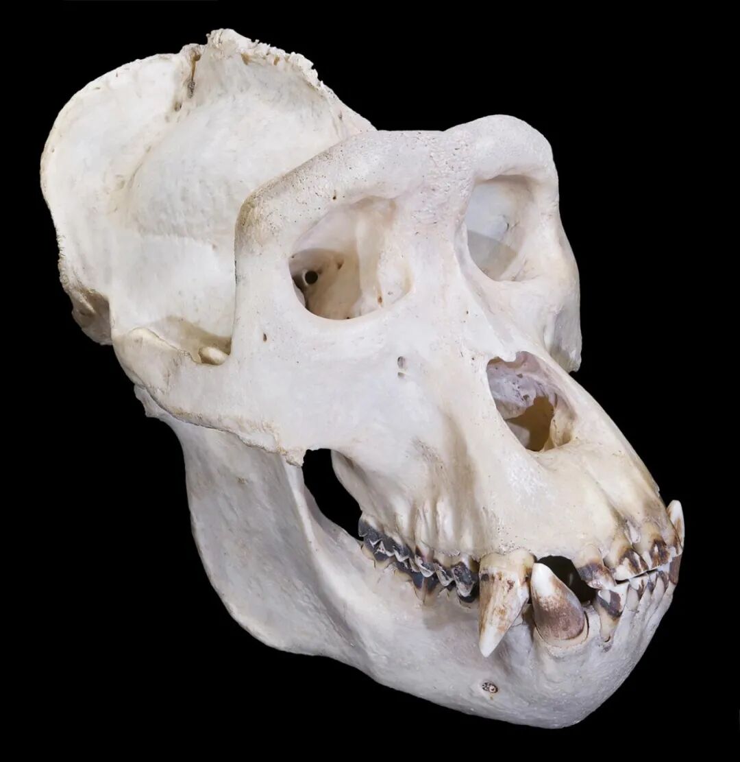 大猩猩头骨上有一块突出的骨骼,帮助它们拥有了出色的咬合力。| 图片来源:Didier Descouens/Wikimedia Commons, CC BY-SA