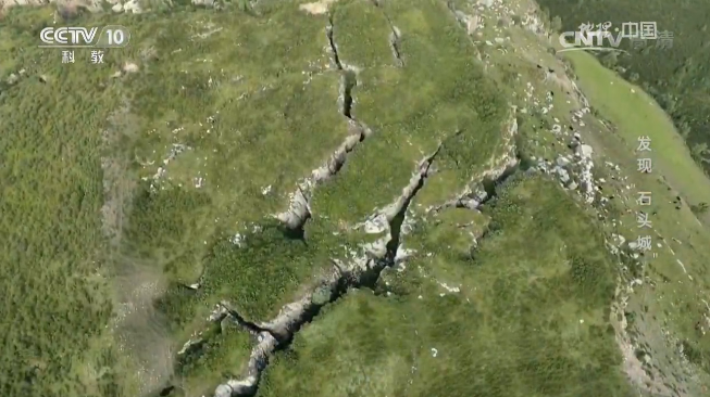 通过航拍画面专家发现狭长的裂缝在山顶上不止一个,从空中俯瞰,它们就向山巅之上被撕开的条条伤口。