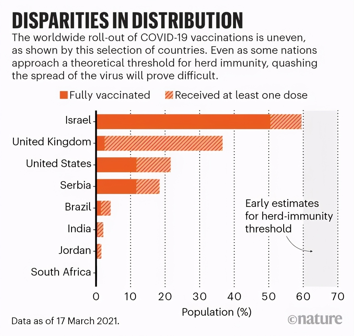 以色列从去年12月开始为公民接种疫苗,在疫苗推广方面领先世界,但群体免疫所达到的效果仍然不确定。以色列理工大学生物统计学者Dvir Aran表示,在疫苗推广早期,全国每天有超过1%的人口接种疫苗;截至3月中旬,约50%的以色列人口已经接种了全部剂次疫苗。他认为,当前主要的问题是年轻人不愿意打疫苗,当地政府不得不开始用免费披萨、啤酒等活动来吸引年轻人。而与以色列形成鲜明对比的是,其邻国黎巴嫩、叙利亚、约旦和埃及的疫苗接种人群比例还不足1%。