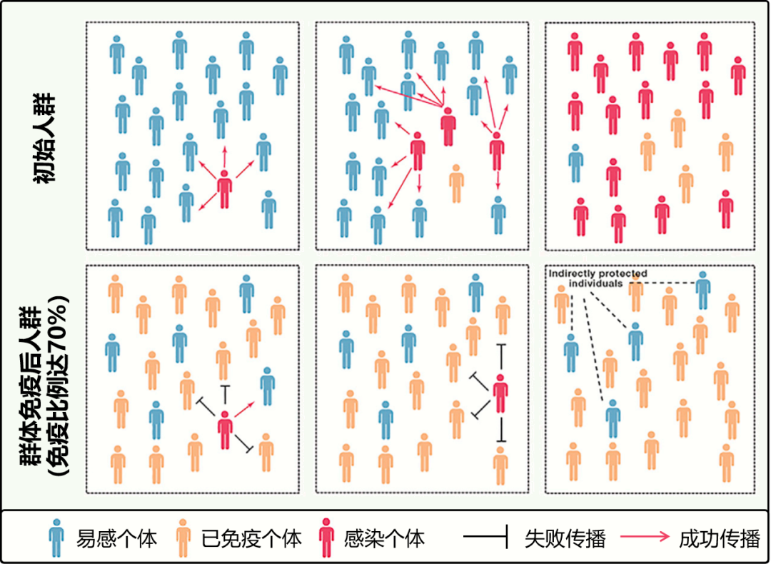 图1:群体免疫策略示意图[1]。群体免疫策略指希望足够多的人获得免疫力、使免疫人群比例达到某个阈值(即群体中易感个体比例足够低),从而间接保护易感人群、阻断病毒传播的策略。一般来讲,这一阈值为已免疫人群达60%到70%。获得免疫力的主要途径则有①人工疫苗接种和②被病毒自然感染。