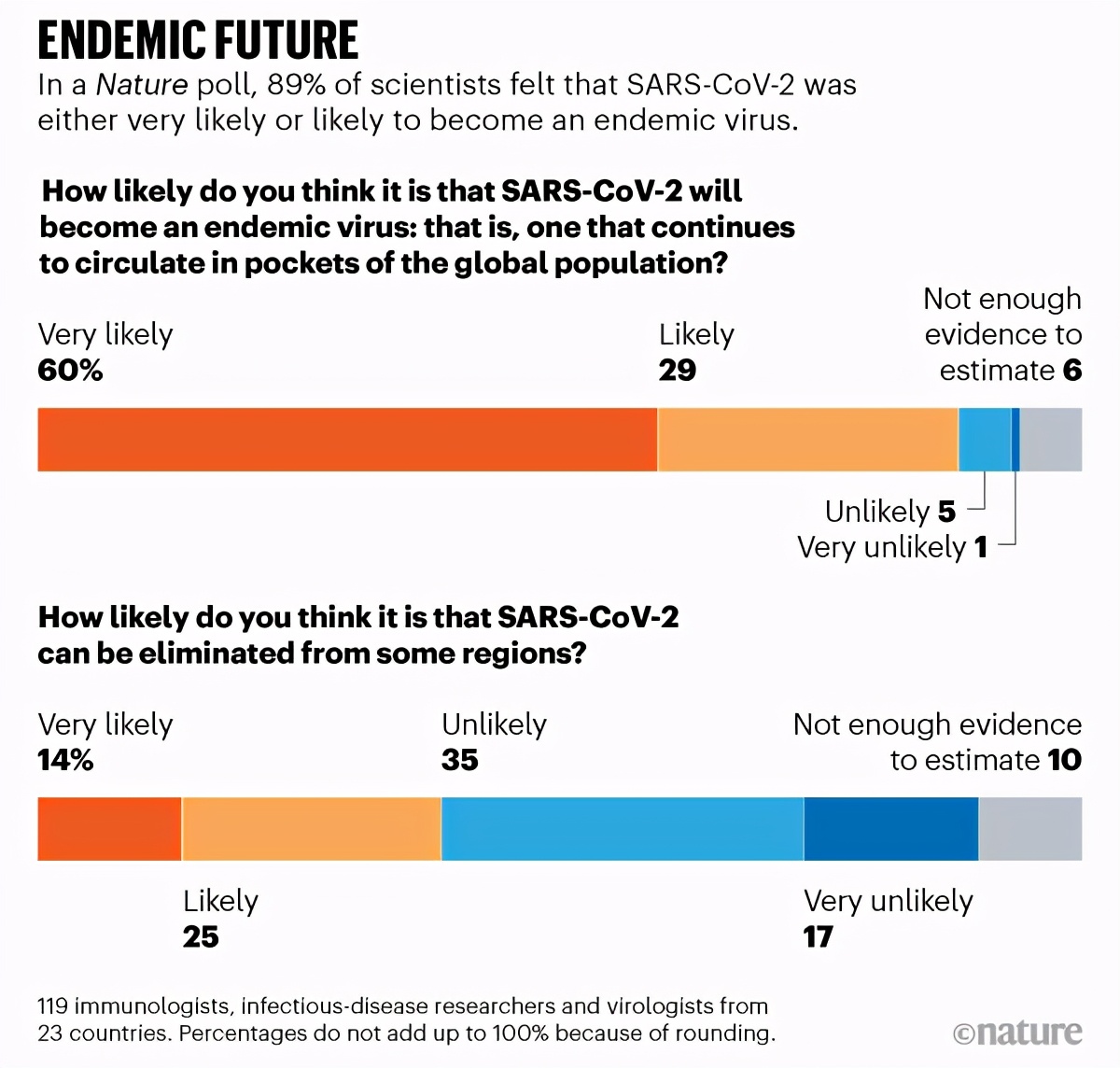 图3:《自然》杂志学者调查中,几乎90% 的受访者认为新冠将成为地方性流行病(endemic)[5]。