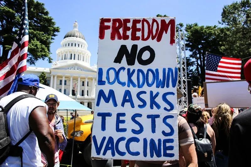 图5:美国加州,抗议者们呼吁结束基于新冠疫情带来的社交限制。[10]