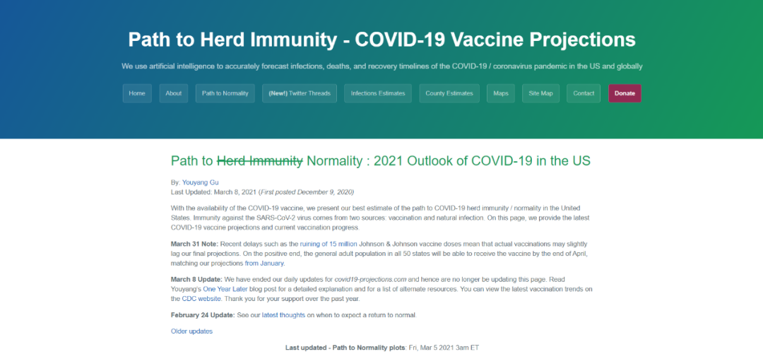 顾友阳(Youyang Gu,音译)是一名独立数据科学家,疫情初期,他个人建立了一个死亡人数预测模型,预测的准确度极高,远超伦敦帝国学院和美国卫生计量与评估研究所的官方预测模型。[2] 之前,他曾把他的疫情预测模型命名为“群体免疫之路(Path to Herd Immunity)”,但现在,他把模型改名为“疫情常态化之路(Path to Normality)”。顾友阳认为,人群对接种疫苗迟疑、病毒突变株出现、儿童疫苗接种延迟,种种因素之下,群体免疫似乎已经很难达到。这一观点与许多流行病学家的想法如出一辙。美国德克萨斯大学奥斯汀分校 COVID-19 建模组织执行会长、著名流行病学家 Lauren Ancel Meyers 也认为:“我们已经放弃了以群体免疫终结大流行的想法。”