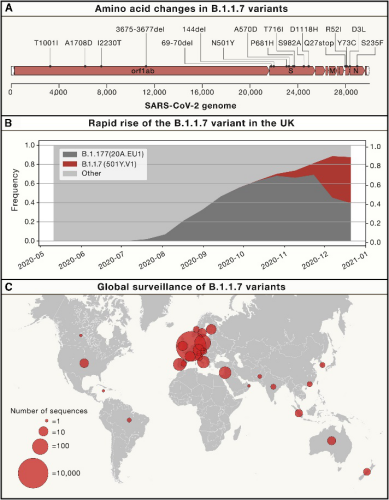 图A,B.1.1.7突变体基因组中产生的突变信息;图B-C,截止2021年1月,B.1.1.7突变体已在包括英国在内的49个国家/地区被检测到。图片来自参考资料3