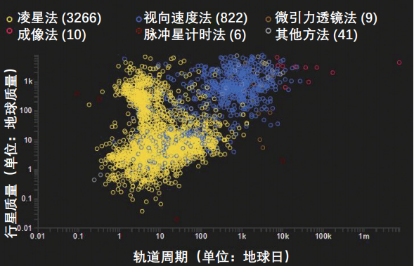图2 截至目前,部分已经测得(或估计出)公转周期及质量的系外行星的探测方法一览。