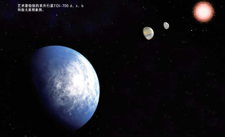 艺术家绘制的系外行星TOI-700 d、c、b和宿主星想象图。