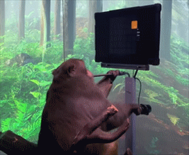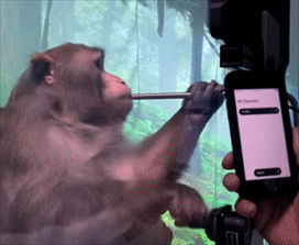 刚开始的时候,研究人员用美味的香蕉奶昔来训练猴子玩乒乓球游戏,你看到猴子左手握住的管子就是奶昔出口,一旦猴子右手控制的操作杆能正确移动屏幕上的板子将乒乓球击回,管子里就能吸出美味的奶昔。通过这种方法,传呼机很快就学会了用手控制操纵杆娴熟地玩乒乓球游戏。