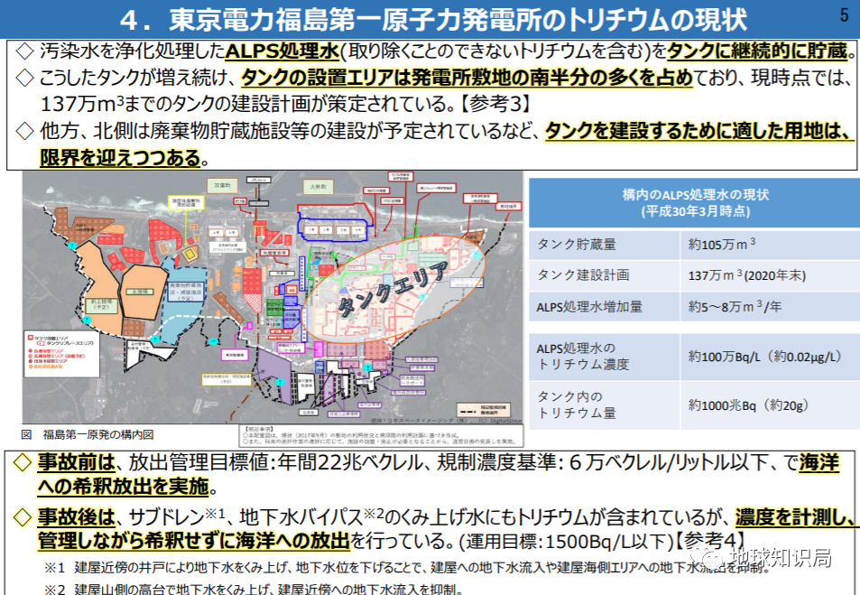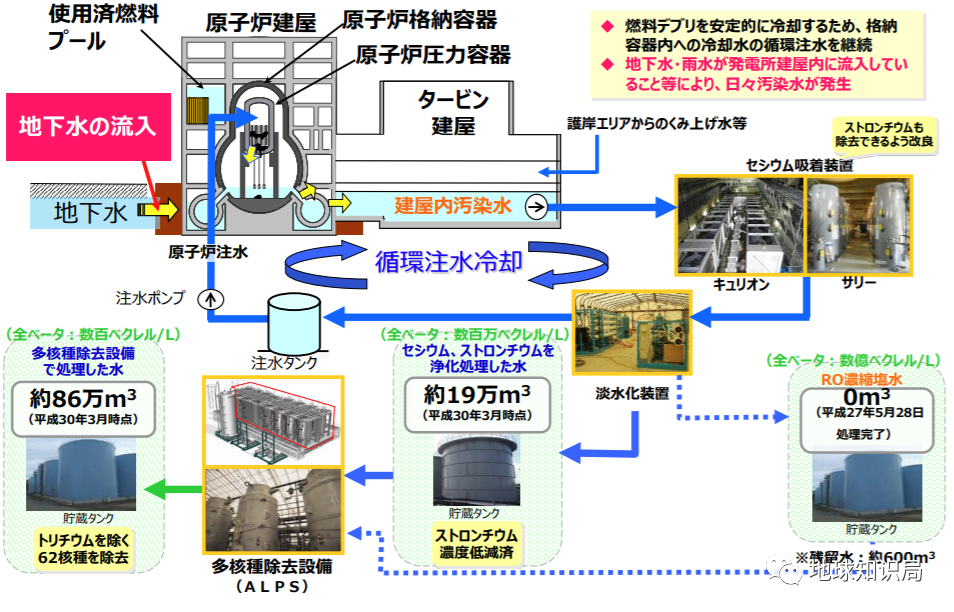 核电站事故自发生以来,日本政府就修建了大量桶型储水设施来储藏这些冷却水。据统计核电站每天约产生120-180吨污染水。被污染的水通过通常称为阿尔卑斯(ALPS)的“多核素去除设备”进行净化,然后存储在核电站厂区内的1037个水箱中。