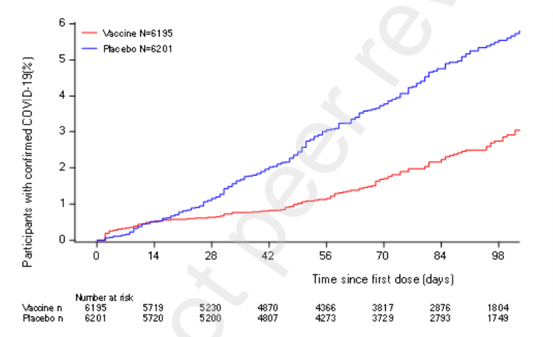 这个问题没法根据目前的临床试验结果来回答。因为试验里绝大部分受试者第一针打完两周后就接种了第二针,没有足够的只打了一针的人做分析。从疫苗接种组与安慰剂组感染率的曲线看,第一针后两周起两组也开始有了差异,所以疫苗或许自此就开始有保护作用了。如果从第一针打完两周后算起,有效性是57.9,但这是建立在绝大部分受试者接受了第二针疫苗的基础上,不是单独一针的有效性。