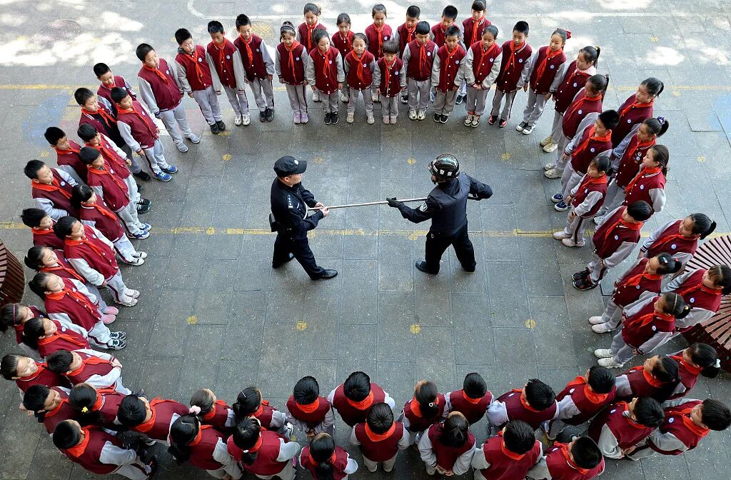4月14日,河北省邯郸市丛台区公安分局光明桥派出所民警开展全民国家安全教育日主题宣传活动,为丛阳小学的学生们讲解公安防暴装备。