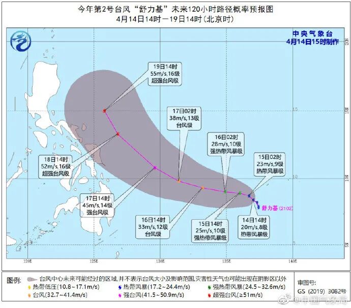 今年第2号台风“舒力基”(热带风暴级)已于4月14日凌晨在菲律宾以东洋面生成。预计“舒力基”将以每小时5-10公里的速度向西偏北方向移动,强度逐渐增强,最强可达强台风级或超强台风级(15-16级,48-55米/秒)。未来三天“舒力基”对我国海区无影响。
