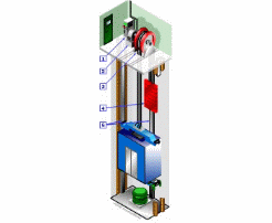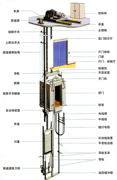 这两种方式工作原理相似,都是由曳引绳两端分别连着轿厢和对重(如下图),缠绕在曳引轮和导向轮上,曳引电动机通过减速器变速后带动曳引轮转动,靠曳引绳与曳引轮摩擦产生的牵引力,实现轿厢和对重的升降运动,达到运输目的。