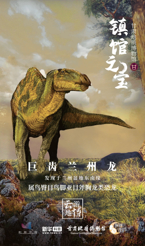 收录于馆内的镇馆之宝巨齿兰州龙标本,于2004年在兰州盆地东南缘发现出土。巨齿兰州龙是世界上已知的具有最大牙齿的植食性恐龙,属鸟臀目鸟脚亚目斧胸龙类恐龙,其胸骨的形状像一把斧子。根据其粗壮的下颌和肋骨,可判断它的体长约10米,高约4米,体重大于5500公斤,属四足行走或偶尔两足行走的恐龙。兰州龙的发现,将斧胸龙类的生存空间从非洲地区扩展到了亚洲。同时,开启了近二十年甘肃恐龙大发现的序幕,此后在甘肃地区发现了大量的恐龙骨骼及足迹化石,向世人展示了白垩纪早期兰州盆地是以兰州龙为代表的大型恐龙动物群生活的家园。