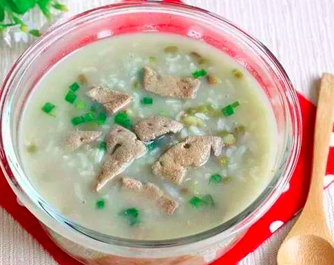 做法:先将绿豆、大米洗净同煮,大火煮沸后再改用小火慢熬,煮至八成熟之后,再将切成片或条状的猪肝放入锅中同煮,熟后再加调味品。