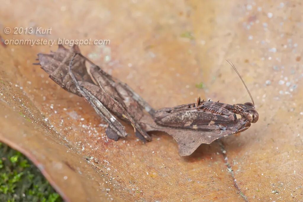 枯叶螳螂在遇到危急情况时收起六足,一动不动,再加上酷似枯叶的外形,想再找到它可得费一番功夫。