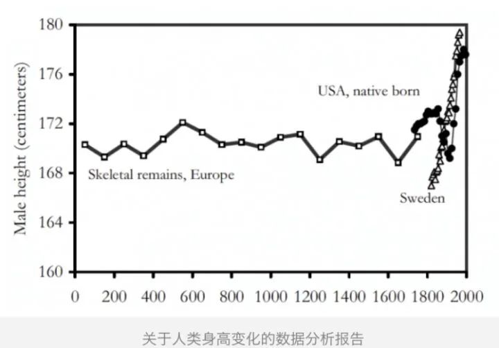 通过对双胞胎的研究,发现身高在遗传因素中占据了大概60-70%左右的比例[1]。而后天因素的影响占据了剩余的30-40%左右。而后天的影响就比较明显了,比如下图是欧洲男性身高的研究,可见在过去许多年,身高一直保持稳定,大约在170厘米左右波动。随着现代化的开始,发达国家的身高急剧上升。