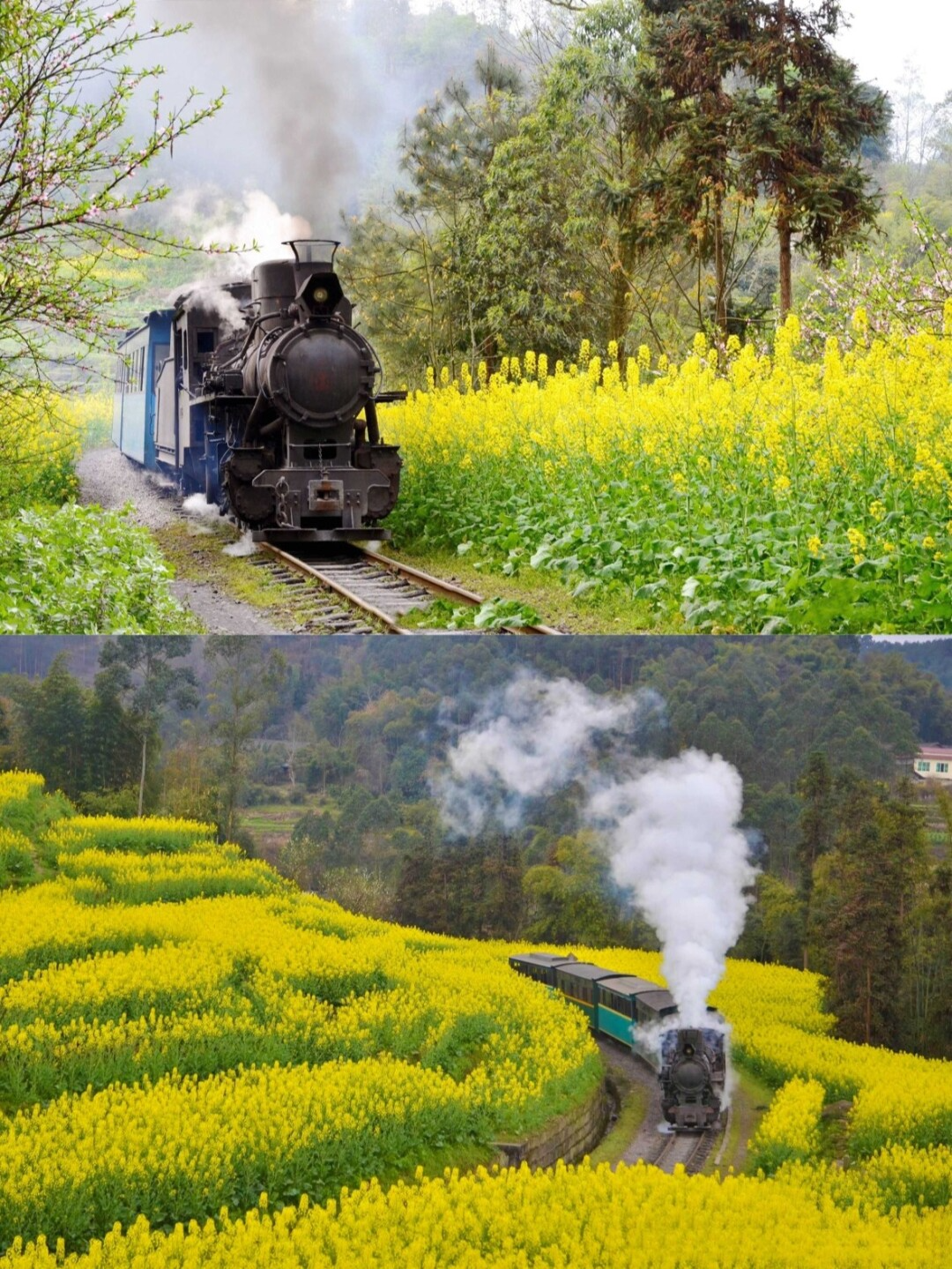 图自小红书博主 四月的米米 如今茶卡盐湖“小火车”复兴 每天忙碌地从外沿深入湖中 不是为了运盐 而是给旅客提供新奇美好的观光体验: 目之所及的天地边界难分 上下对称的辽阔景观 随着火车缓缓地行进 在视线中不断变动,格外曼妙 下了火车,沿着通道 就可以走入湖中游玩 拍摄纯净的景色和自己的倒影 图自小红书博主 旅行美食小马甲 感受完“天空之镜”的奇观 还可以参观机械化采盐作业 夜观漫天星斗 以及在雕塑区欣赏造型各异的盐雕 四川嘉阳小火车 一秒穿越蒸汽时代 乐山市犍为县的嘉阳矿区位于四川南部 每天都会听到“呜——呜——”的汽笛声 有“工业革命的活化石”之誉 靠烧煤产生蒸汽动力的 嘉阳小火车 仍在正常运行 每当春天来临 色泽黝黑、富有金属质感的火车 从金黄色的油菜花中穿行而过 喷出白色的蒸汽 都会吸引无数摄影爱好者架起长枪短炮 “捕捉”这辆开往春天的列车