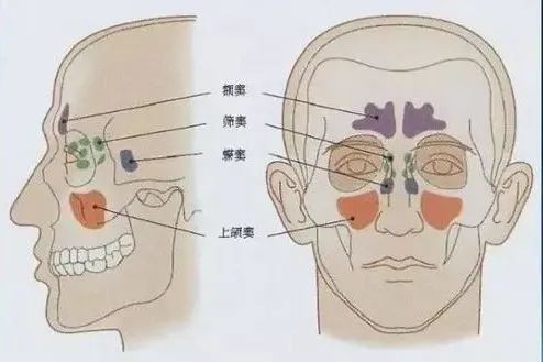 鼻窦:鼻窦有四对,即额窦、筛窦、上颌窦及蝶窦,它们是鼻腔周围多个含气的骨质腔,隐蔽在鼻腔旁边。上颔窦位于鼻腔两旁、眼眶上面的上颔骨内;
