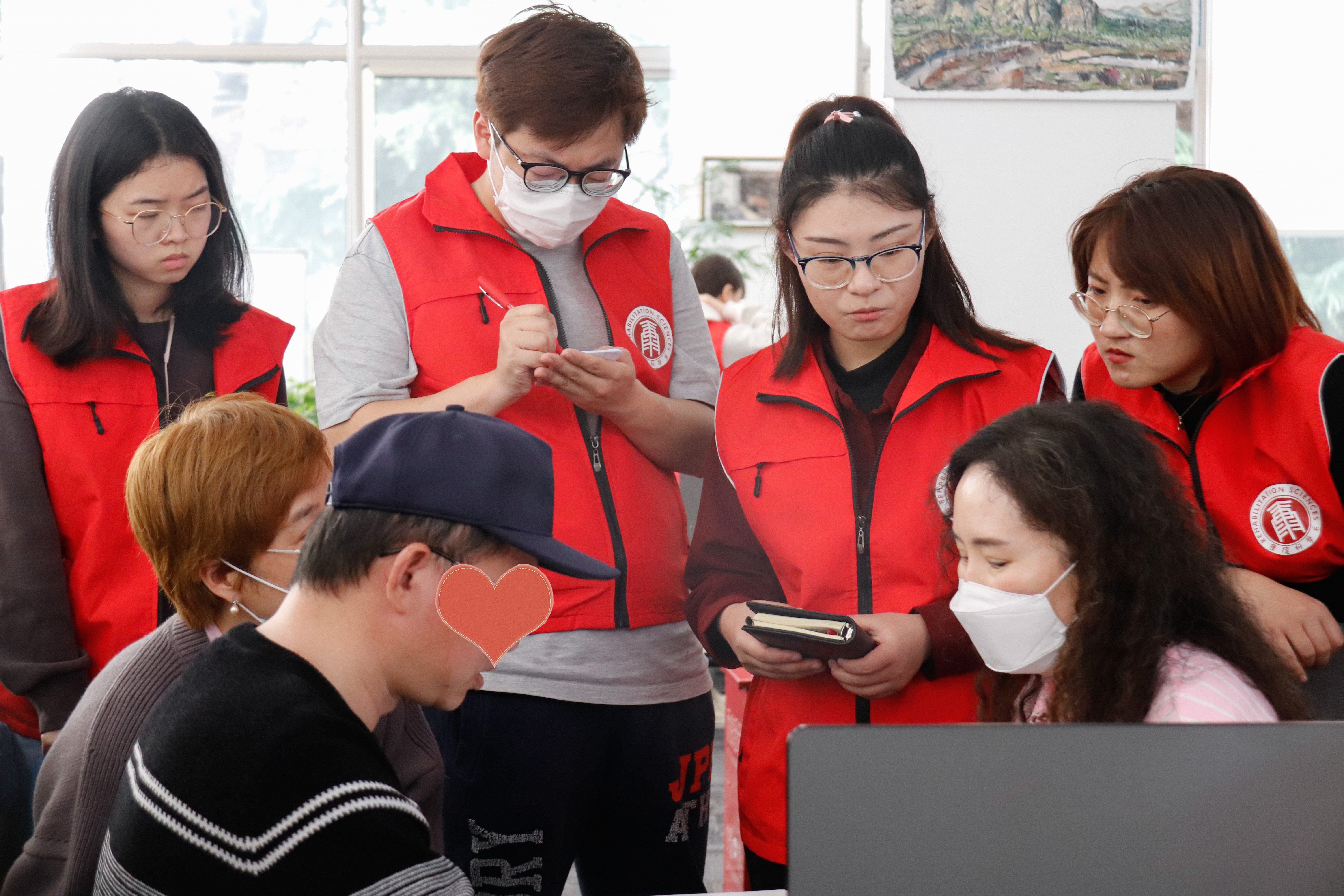 华东师范大学康复科学系金河庚副教授为患者提供失语症康复咨询,百灵志愿者为患者提供全程服务支持