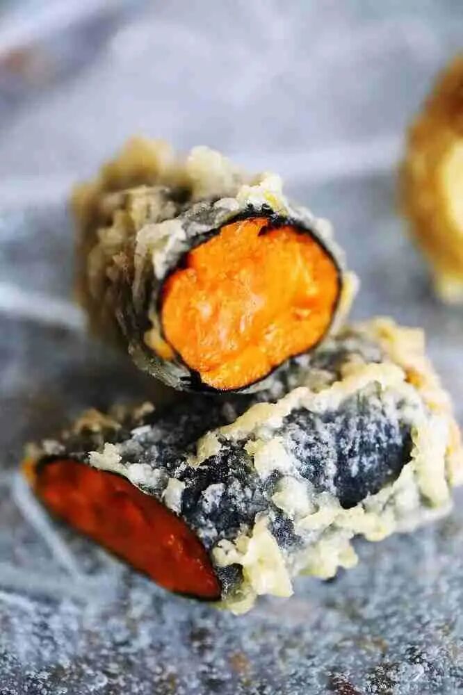 除了生食,日料里还会将海胆制作成天妇罗。用紫苏叶包住海胆,再裹上面衣油炸。一口咬下去,穿透最外侧的脂肪,搭配紫苏叶的清香,来到内部,介于生熟之间的海胆,带着一丝鲜甜,不同口感、滋味的碰撞令人着迷。