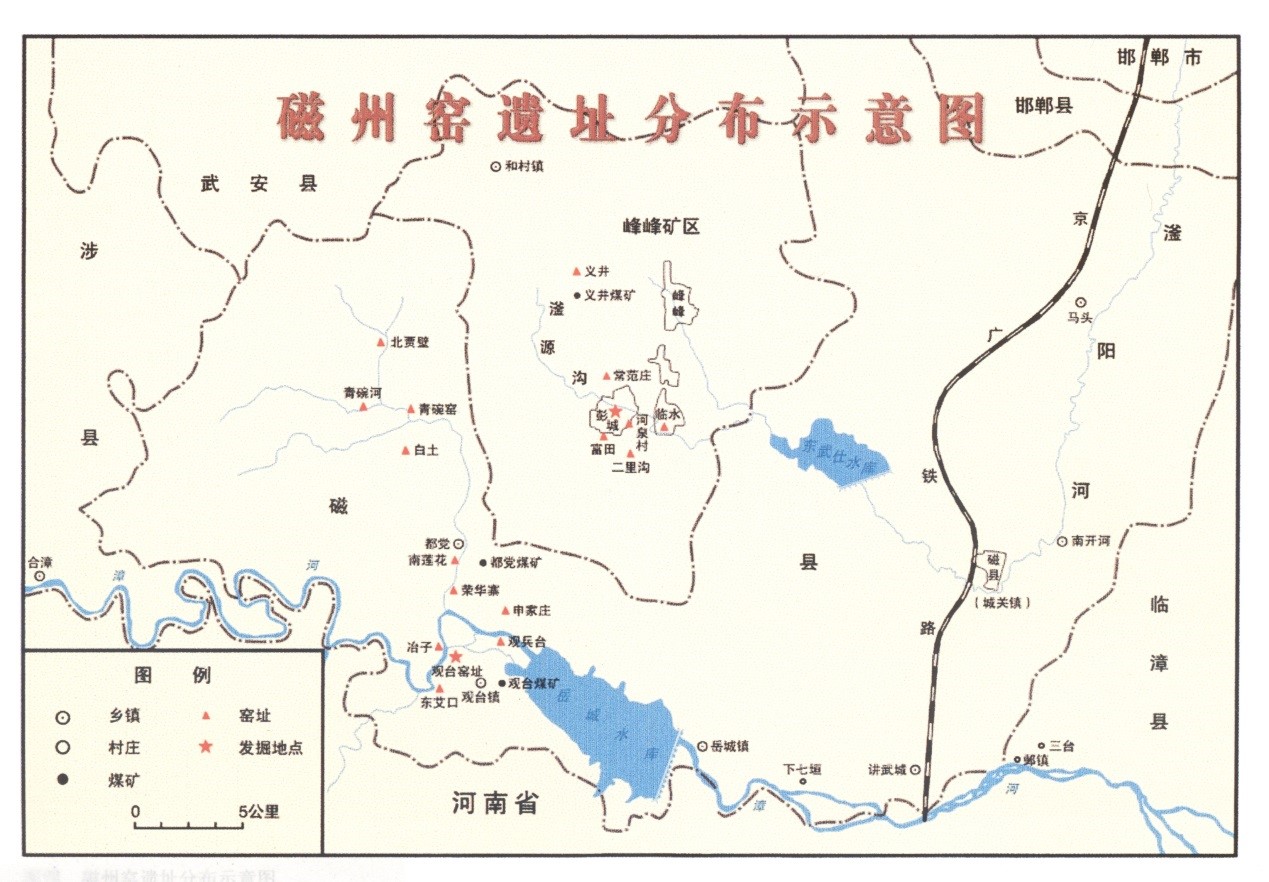 磁州窑窑址位于今河北省邯郸市彭城镇和磁县观台镇一带,是北方宋元时期烧制瓷器品种最为丰富的瓷器窑口,素有“南有景德、北有彭城”之说。据考察,磁州窑创烧于北宋中期并达到鼎盛,南宋、辽金元、明清仍继续烧制,烧造历史悠久,具有很强的生命力,瓷器流布范围极广。