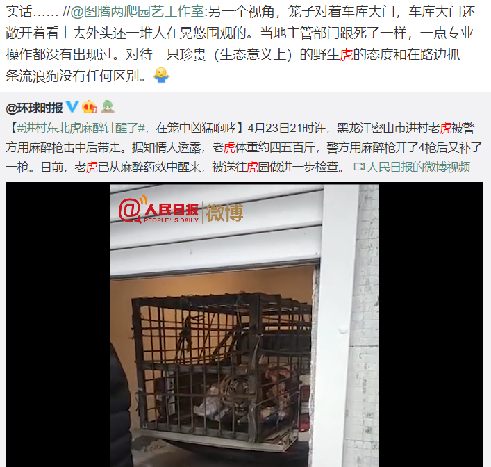它紧张地蜷缩于废弃屋后的草丛里、它不安地在暴露的田间行走、它左顾右盼后压低了身体小跑穿过道路、它愤怒地扑向追踪的汽车和暴露的人类却在攻击后立刻离开,即便是在被麻醉枪击中后,它也是怒吼着从草丛里窜出,攻击后便立刻退回草丛里。想想看,除了老虎有足够的力量发起反击以外,这与两个月前,在通州玉米地里被车辆追逐拍摄的大鸨的行为有什么本质的区别?再次强调一下:这只老虎并没有出现任何在未经干扰的情况下主动攻击人的行为,这符合我们对一只正常的野生虎的认知。视频中可见的三次攻击行为全部发生于被惊扰、被捕捉的过程中。且它在攻击时也并未有意识地杀死被攻击者,整个过程更像是一种对骚扰的驱离。但老虎的害怕并不是通过蜷缩成一团、瑟瑟发抖,或者情绪失控地玩命逃窜来体现,它会尝试躲避、离开,只是昨天现场同样不知所措的人们并没有给它这个机会。客观地说,4月23日最后的处理方式是得当的。在错过了最前期的冷处理窗口之后,捕获老虎已经成了最好的解决方式——总比一枪打死好。事实上当现场出现了对人身的巨大威胁后,将老虎击毙也是一种迫不得已但行之有效且无可厚非的选择,只是这种选择在老虎保护优先的今天势必会给决策者带来不小的压力。这只老虎将会如何处置?它以后是不是会养成袭击人的习惯?如果这不是一只虎,而是一只鹿,甚至是一只雪豹,那么后续处理将会非常简单:如果身体无碍,则野外放归。因为这些动物对人类并没有威胁,放归时只需要考虑其栖息地和食物是否符合其生存需求。但一只老虎、特别是一只展现出对人类的攻击性的老虎,则很难做出这种选择。比如按照哪里救助哪里放归的原则,这个老虎应该被放到密山附近。但这不可能——当地的居民肯定无法容忍一只攻击过人的虎被放在附近。事实上任何一个地方的居民都不会接受这个选择,设身处地想一下,如果我住在那里,方圆几十里内被人送来了一只曾经攻击人的老虎,我可能也心里打鼓。特别是一些流言:一只老虎一旦吃过人肉就会不断吃人。大牛的公众号发过一篇文章,关于印度人虎冲突研究的。这里面提到:绝大多数情况下,老虎会提防并避免遭遇人类。但老虎致人伤亡的事件相当罕见。当它们进入人类聚居区捕猎家畜时,有时会被愤怒的人群包围,从而发生伤人事件。极偶尔地,当老虎与人不期而遇时,它们会发起攻击或杀死人,有时候会吃掉部分尸体。然而,这类遭遇并不会使老虎持续攻击人类。应对这类事件,只需赔偿受害者家属,而不需要更多的管理干预。2011年,黑龙江密山市,被猎套伤害致死的东北虎。/图源网络根据印度一些地方的历史纪录,尽管极其罕见,个别老虎开始把人当作“猎物”,并时常跟踪人类。目前,仍没有科学依据表明老虎的食人行为是某种生态或者社会因素的后果。这种行为,似乎受到不寻常因素的影响。因此除了极少数情况,大多数攻击过人的老虎并没有展现出形成攻击人习惯的特性。这只出现在密山的老虎的攻击行为,完全不符合食人虎捕猎的诉求,而更符合一种防御性攻击的行为。关于它以后是否还会攻击人,可以预料如果再次出现被人类干扰的情况它依然会做出类似的攻击举动;但它会在没有干扰的情况下主动攻击人吗?我认为大可不必担心。国家公园里本来就有虎,新出现的个体和本地个体会产生争斗——如果是自然发生的,则不用干涉,但人为放一只老虎进去则是对自然的干涉,而这个步骤是需要严格的科学评估的。比如一个区域只有雌虎,放一只公虎进去是可行的,反之亦然。因此如果这只老虎被放归野外,把它运送到老爷岭一带环境较好、目前没有同性别定居成年虎的保护区或林场里,似乎是唯一可行的方案。这么做的风险在于:它可能会继续游荡,寻找自己认为合适的领地,并因此再次接近人类社区。事实上最新的影像资料表明这只老虎的眼睛有伤:它的右眼明显充血。我们并不知道这个伤是什么时候造成的,是否可以治好。看上去它的脸上并没有抓痕,因此这不像是在野外和其他老虎争斗中导致的伤。当然我也并不认同网上关于这是被麻醉针扎伤的说法:要击中它的眼睛显然不如打在它身上那么容易,视频中我们可以看到麻醉针都是打在它的臀部。但是否是在捕捉过程中受伤现在并不能确定——毕竟它曾经咬爆过车胎,这个过程中受伤也很正常。这需要有白天的影像来对照,但我还没看到有清晰的能看清面部的影像(这多少说明处置过程缺乏经验)。这只老虎在白天展现出来的体态、活动能力,都表明它是一只能在野外养活自己的老虎。救助的最终目的是让野生动物回归野外,在这个原则的指导下,对这只已经被送到虎林园的虎的放归评估应该是非常谨慎和科学的。虎林园应该拥有成熟的老虎养殖和疾病检测经验,在对这只老虎进行病原检测和身体检测后,应该提出一个可被公布的评估报告,而结论则应该是有科学依据的。来自于全球的老虎野外研究应该能提供很多资料数据,也能够找到很多野生虎在受伤、残疾的情况下在野外生存的案例,以及正常野生虎被救助、捕捉后放归的例子。通过对这些案例的分析,结合这只老虎的身体情况,来作出一个负责任的评估,是接下来所有人期待看到的。随着保护的加强,可以预见老虎的数量将会增长。随着越来越多的老虎迈出寻找领
