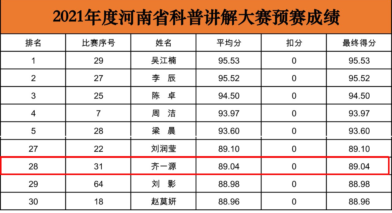 生命科学馆推送选手齐一源同学,来自我校20级临床卓越班,经过层层选拔,在校赛中脱颖而出,他以《关于高血压那些事》为题传播了高血压的成因、并发症和预防等知识。作为唯一一名年龄最小的学生选手,他竭力发挥,气场十足,以高亢洪亮的声音、通俗易懂的语言讲解着科普知识,赢得现场评委和参赛选手的阵阵掌声。经过指导老师邓同兴、张斌老师的倾心指导及反复演练,齐一源同学最终以89.04分,总排位第28名的成绩,成功晋级决赛30强。