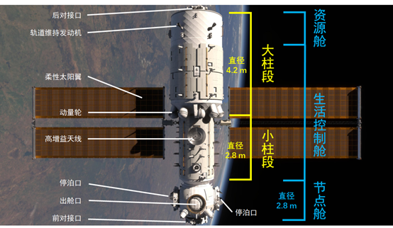从整体上来看,“天和”核心舱可以分为三部分——节点舱、小柱段与大柱段。