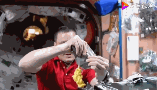 为了防止食物残渣漂浮,有些食物也是用复合塑料膜袋包装好的,宇航员要把塑料膜袋剪开一个口,然后再拿餐具伸进去吃。当然,也有一些宇航员喜欢特立独行,比如下面这位↓